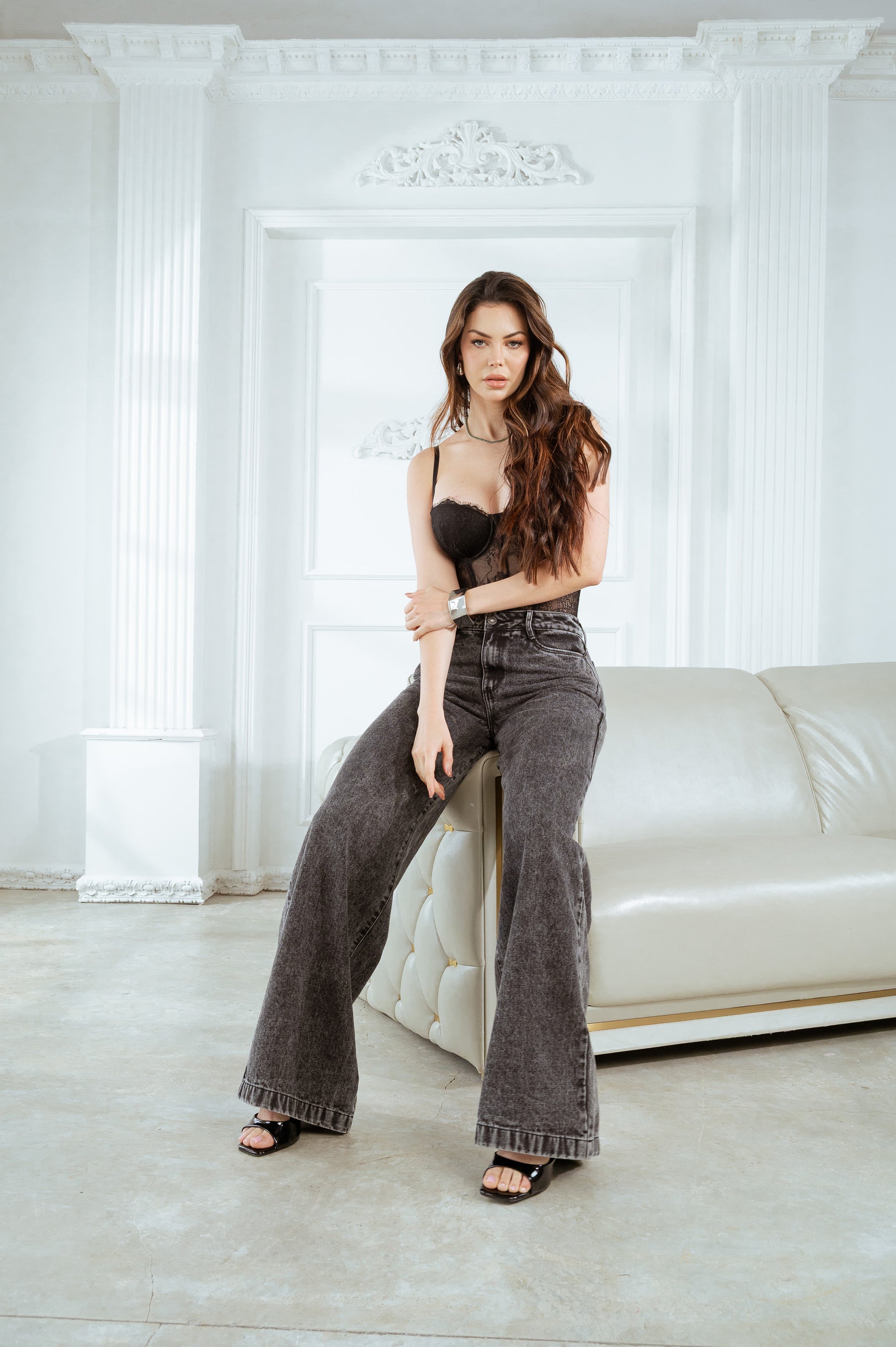 Jeans palazzo , bota ancha , clasico , tono gris , rigido.