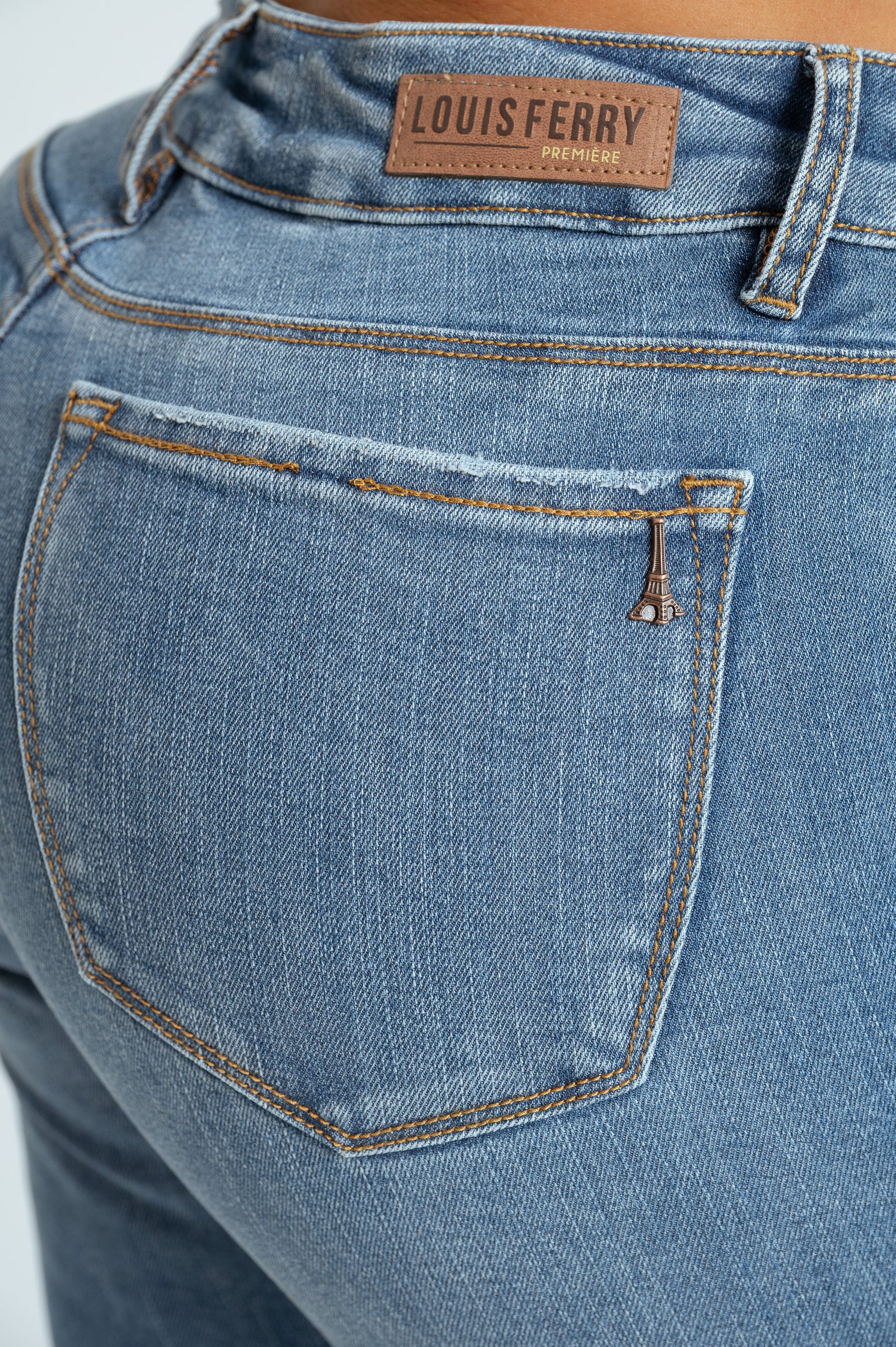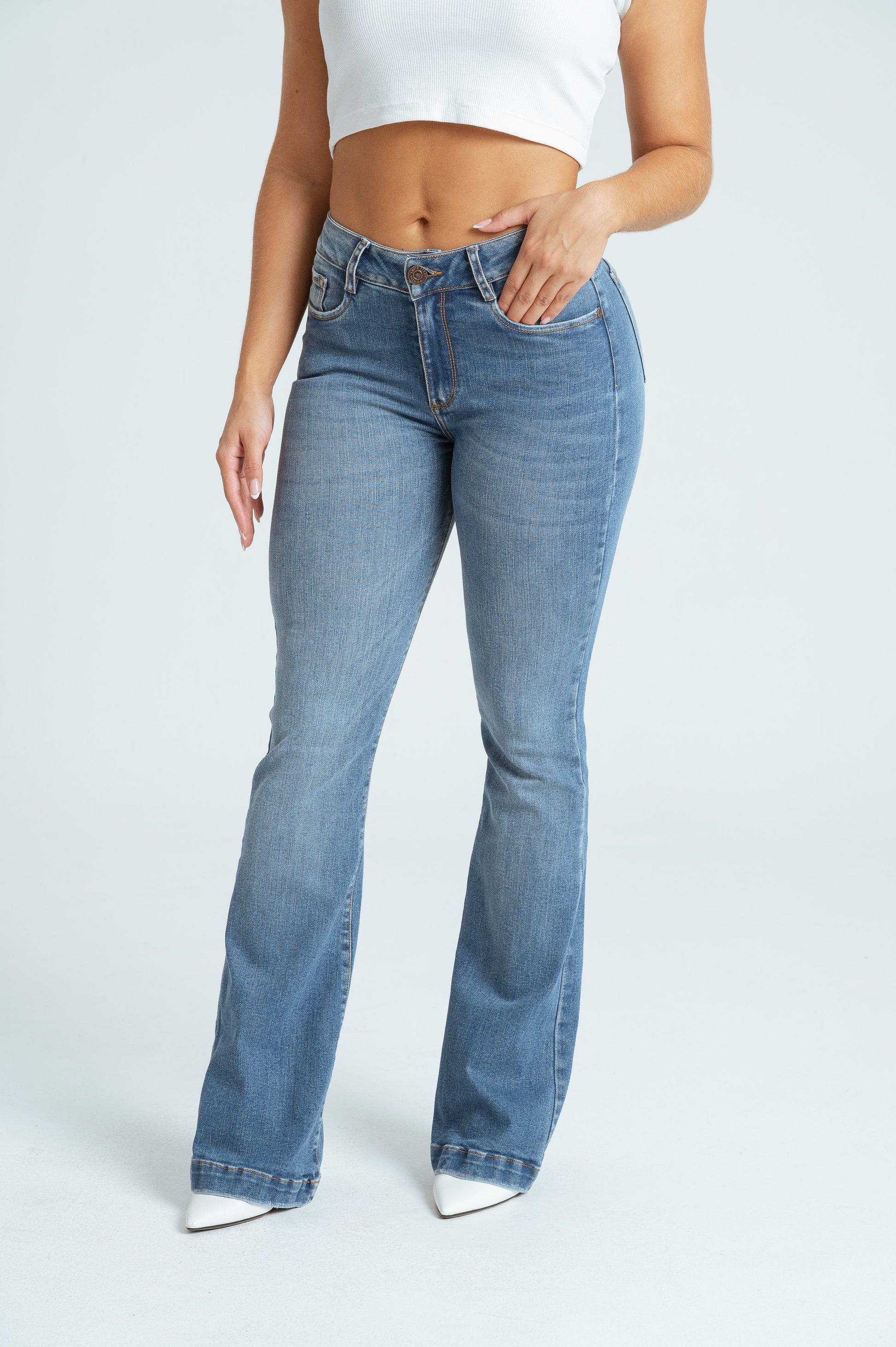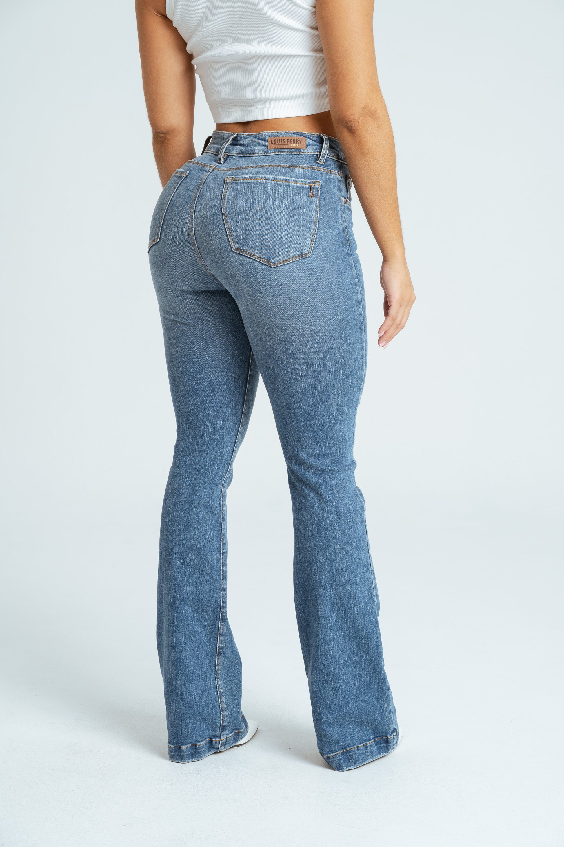 jeans bota campana , tiro alto , tono azul medio ,strech.