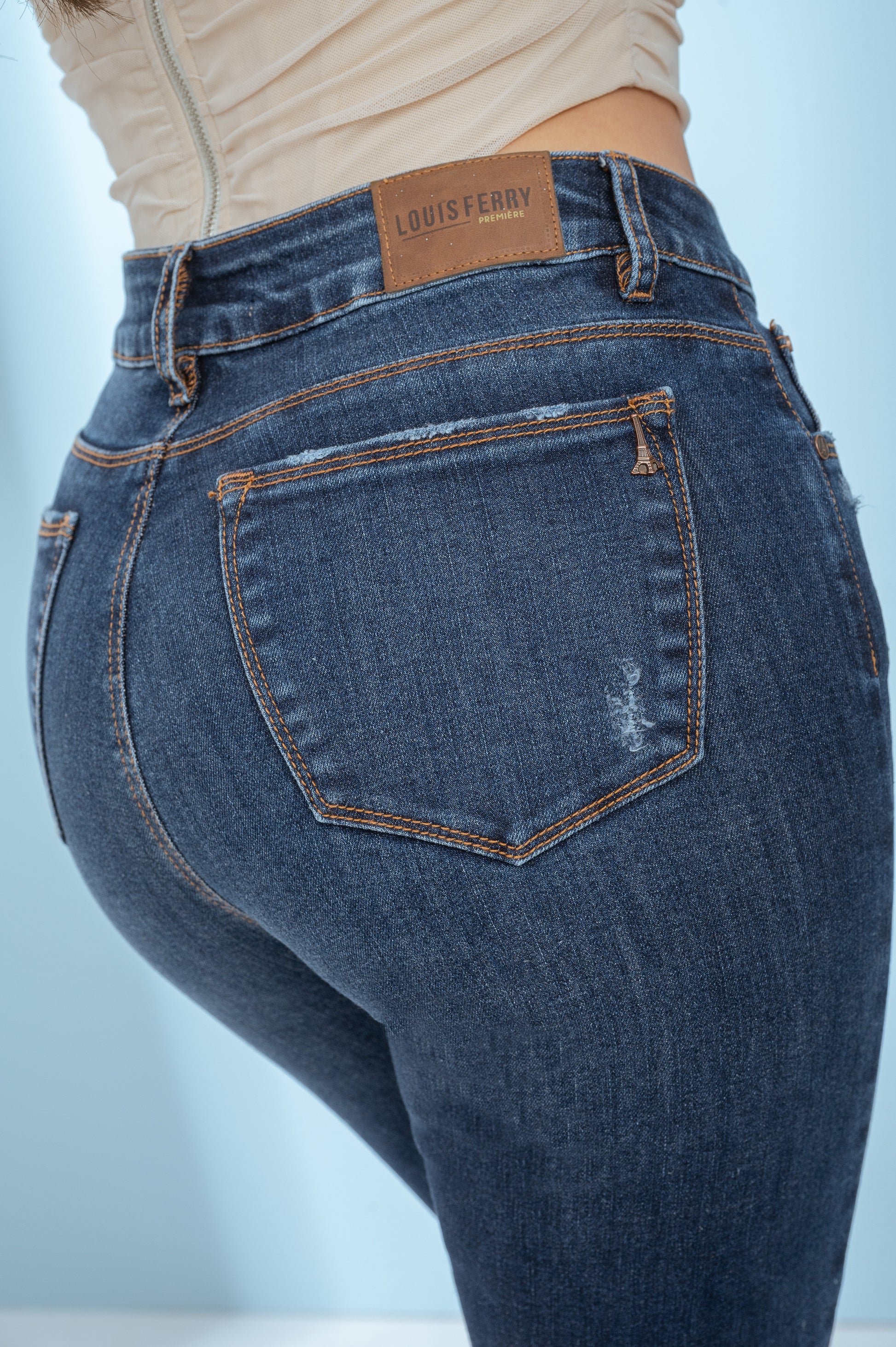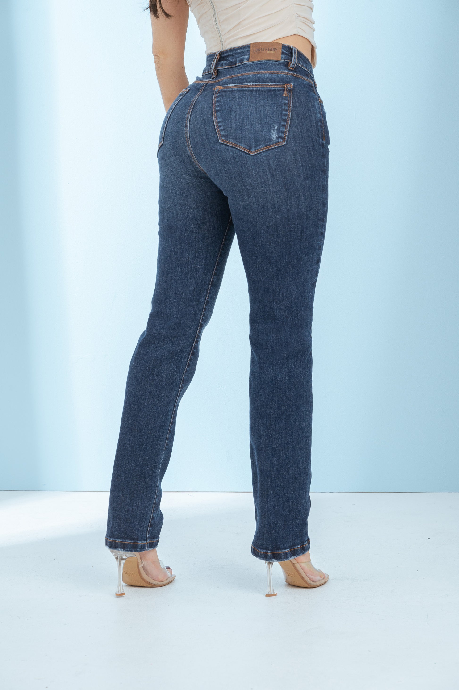 jeans bota recta , tono azul oscuro , tiro medio , strech.