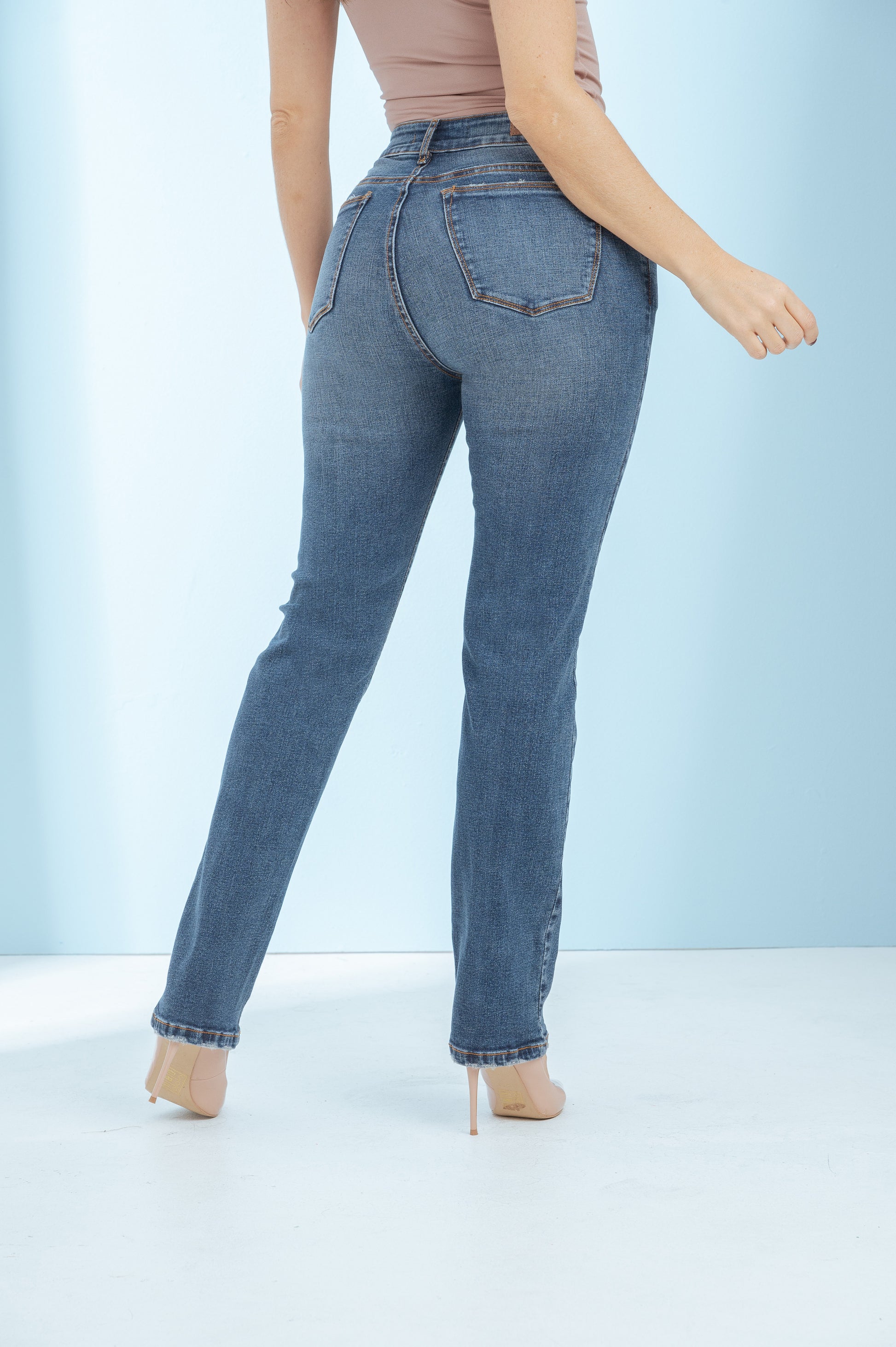 jeans bota recta , tono azul medio ,tiro medio ,strech.