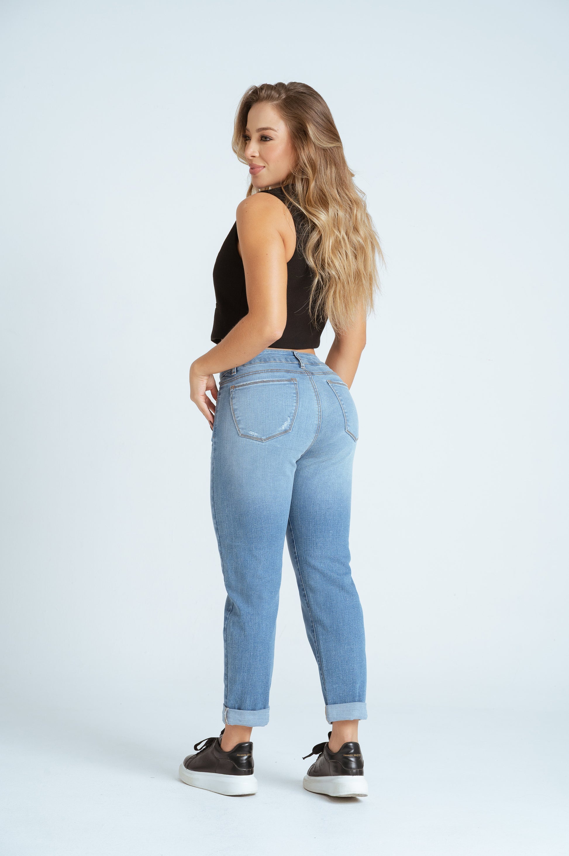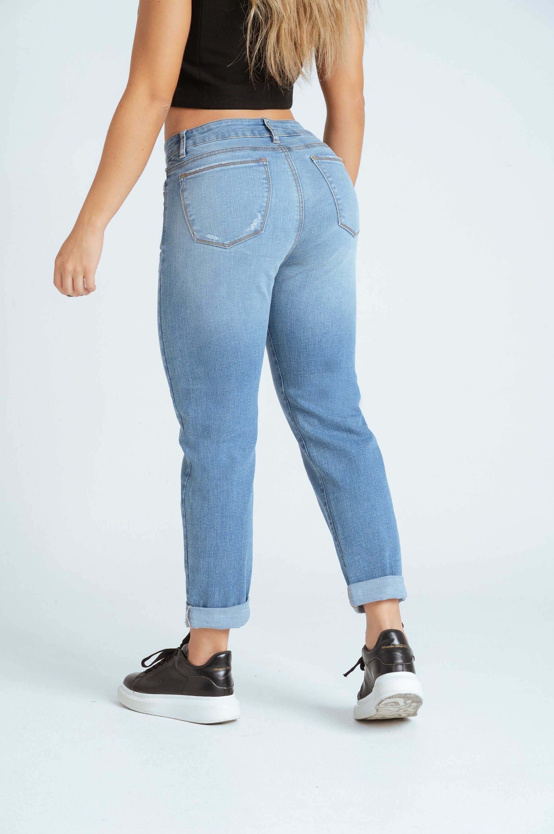 Mom fit jeans , bota doblada , tiro medio , tono azul claro , strech.