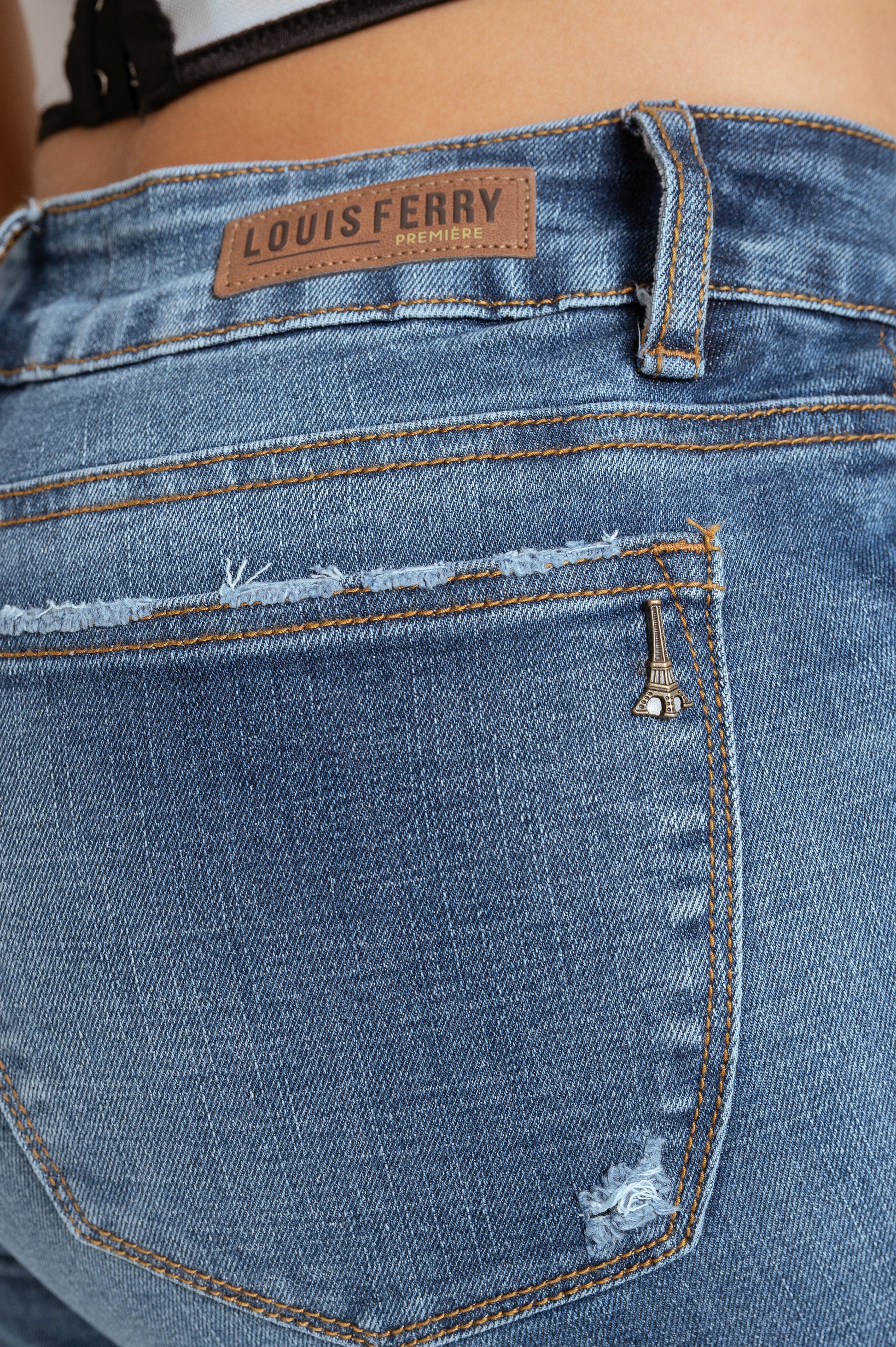 Mom fit , tono azul medio , bota recta , strech.
