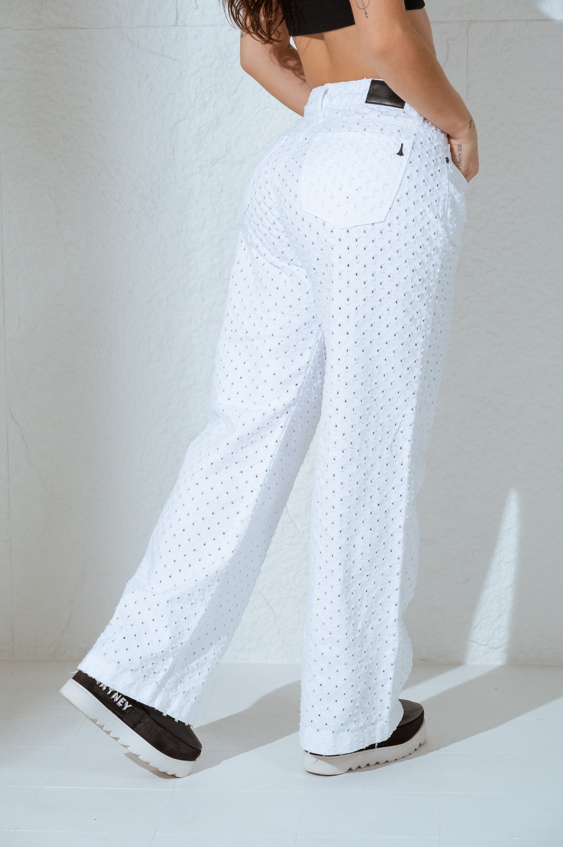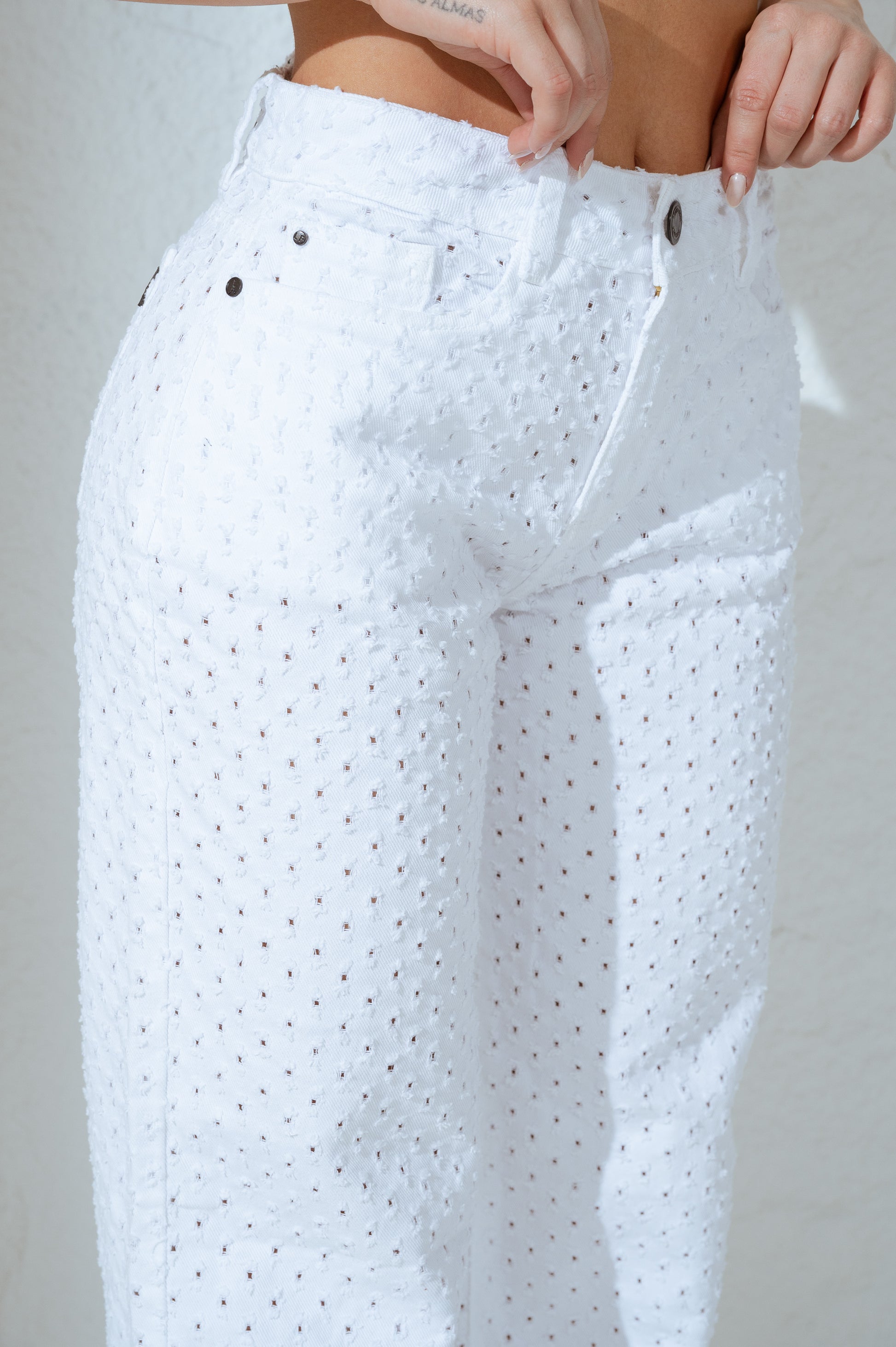 Mom flare blanco , tela con diseño , bota ancha , tiro medio , tela rigida.