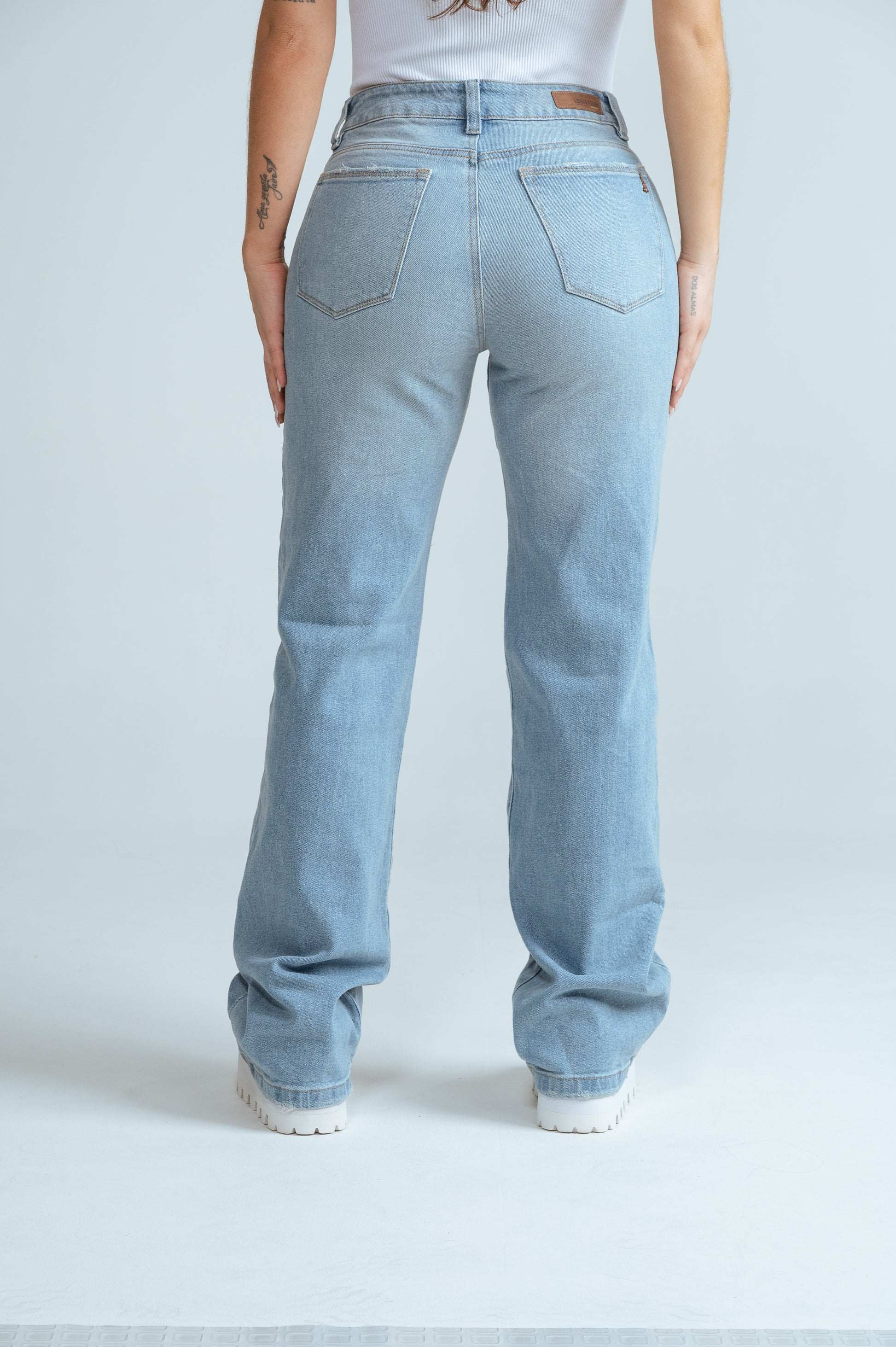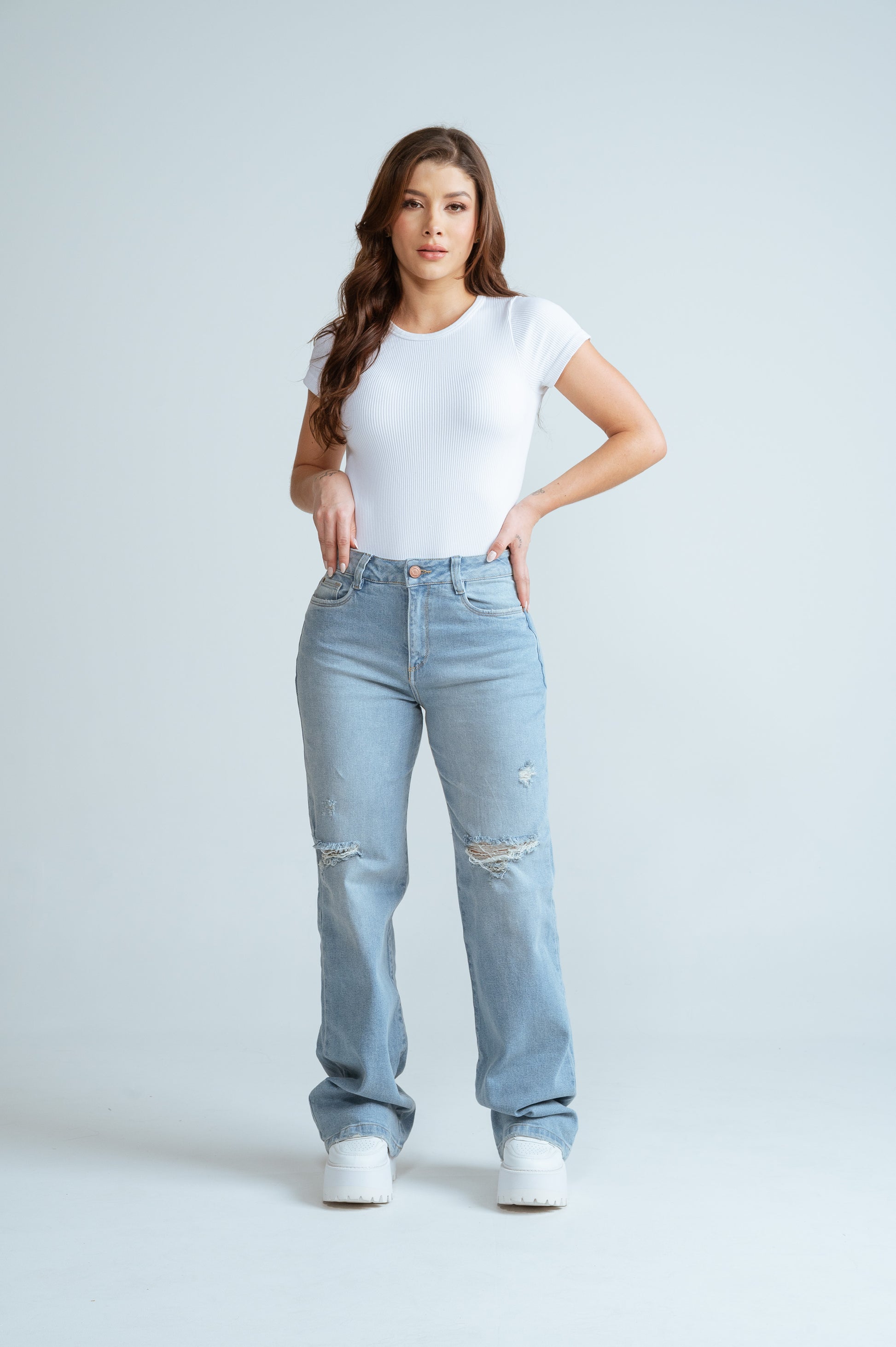 Jeans mom flare , tono azul claro , bota ancha , con rotos , tiro alto , tela strech.