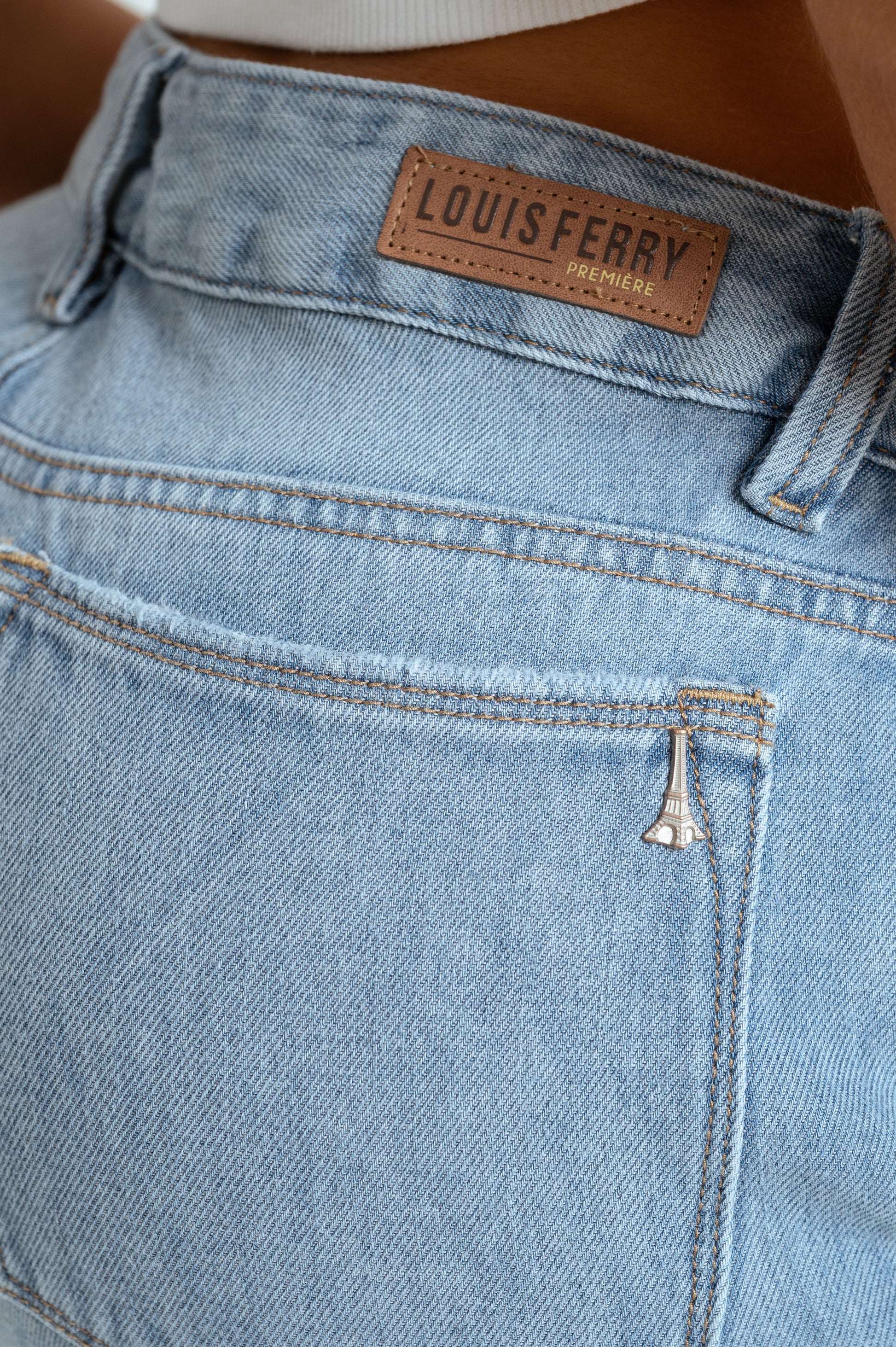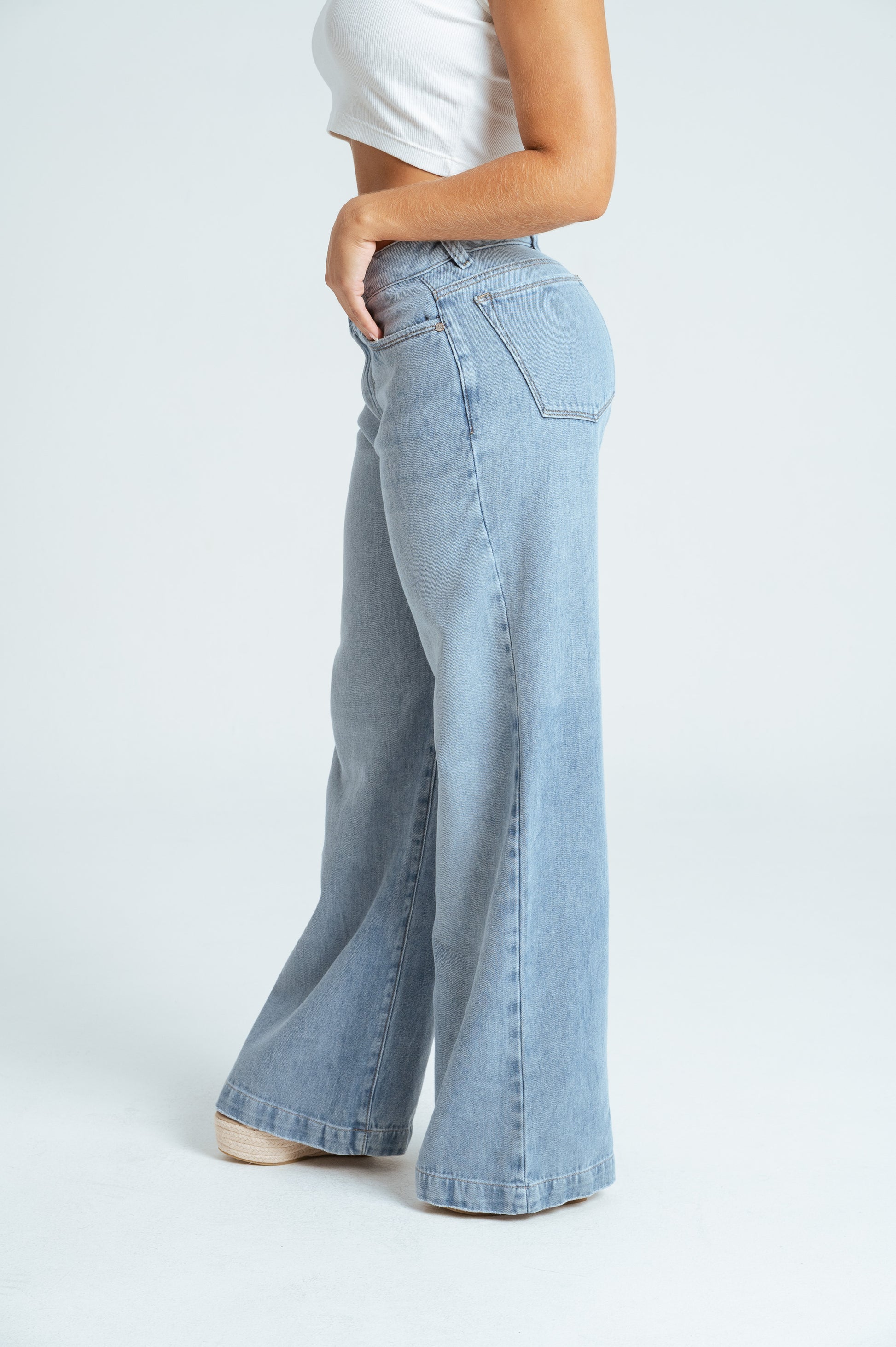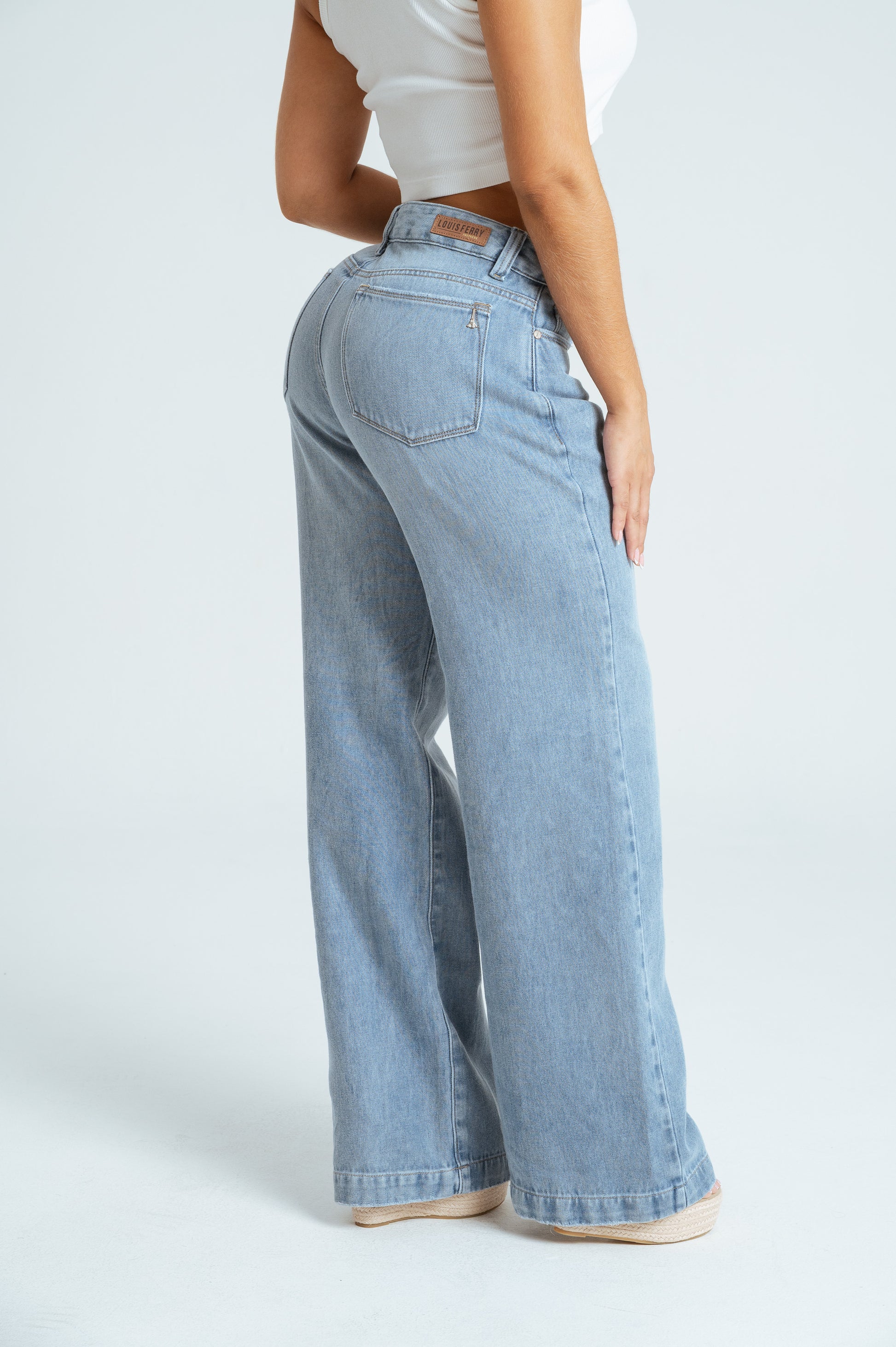 Jeans mom , tono azul claro ,tiro alto , semi rígido.