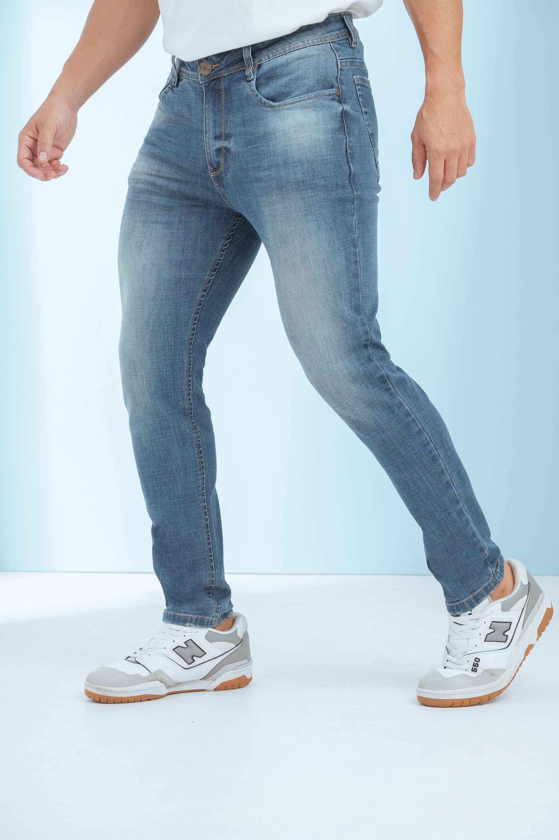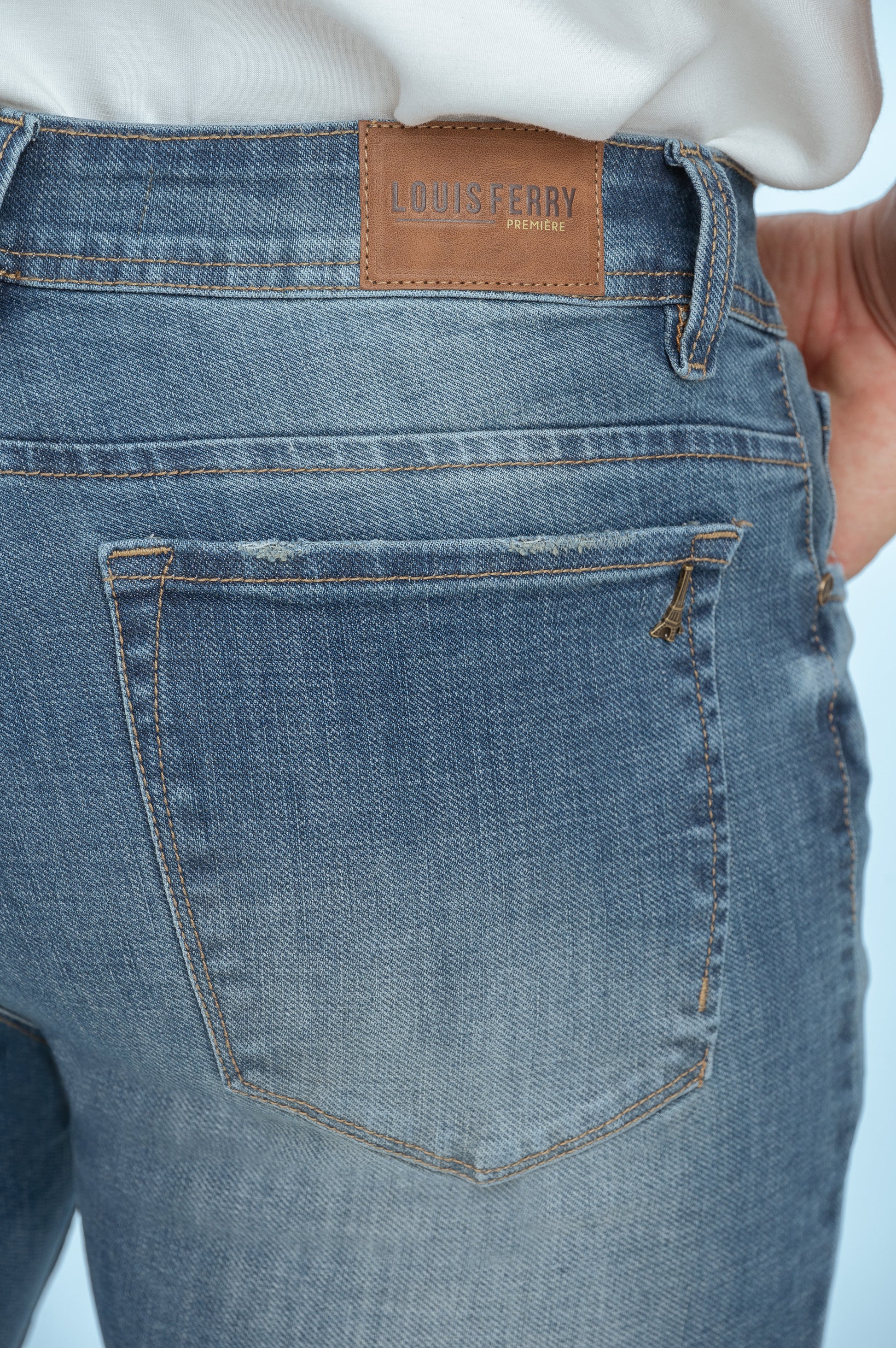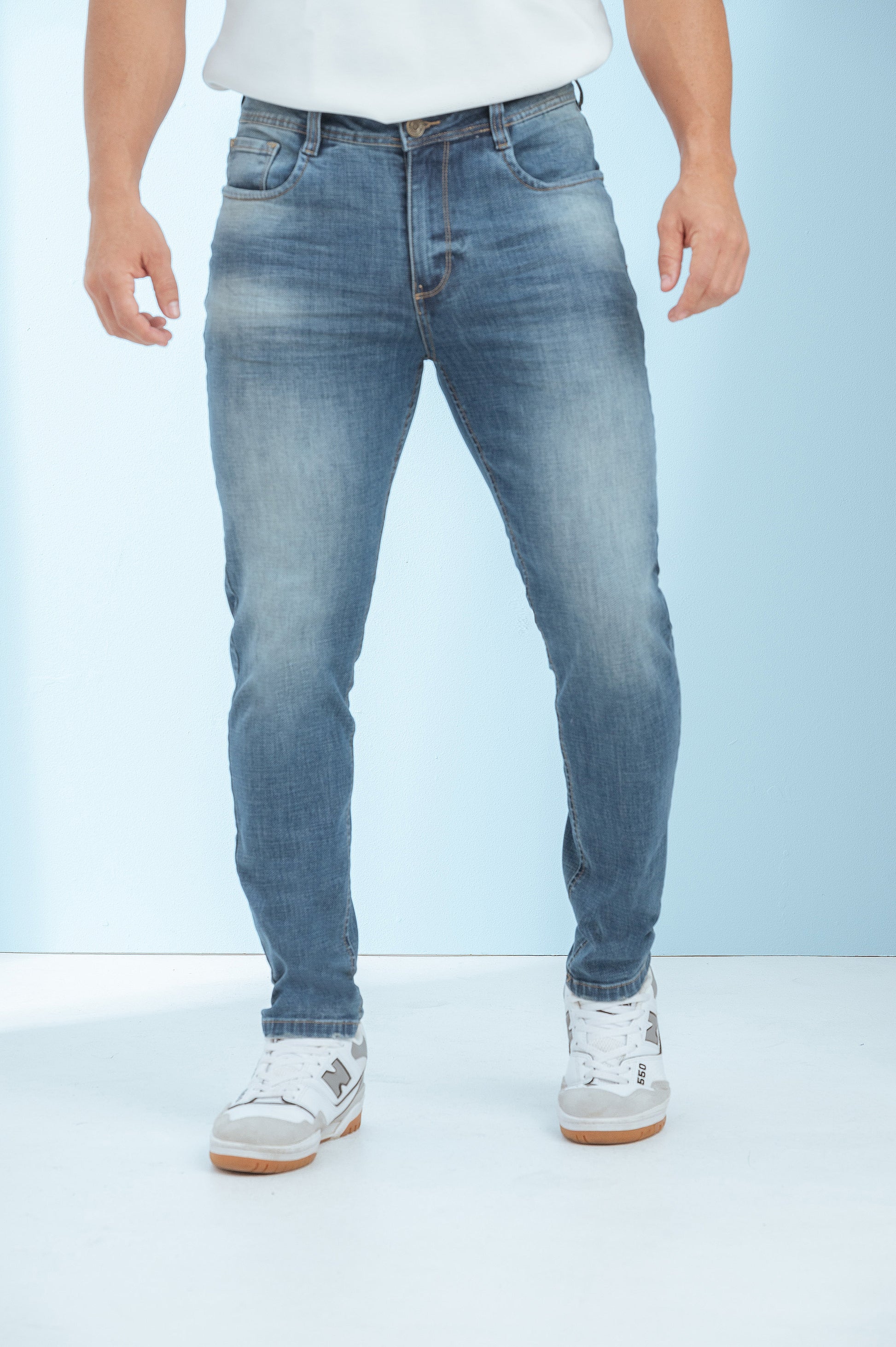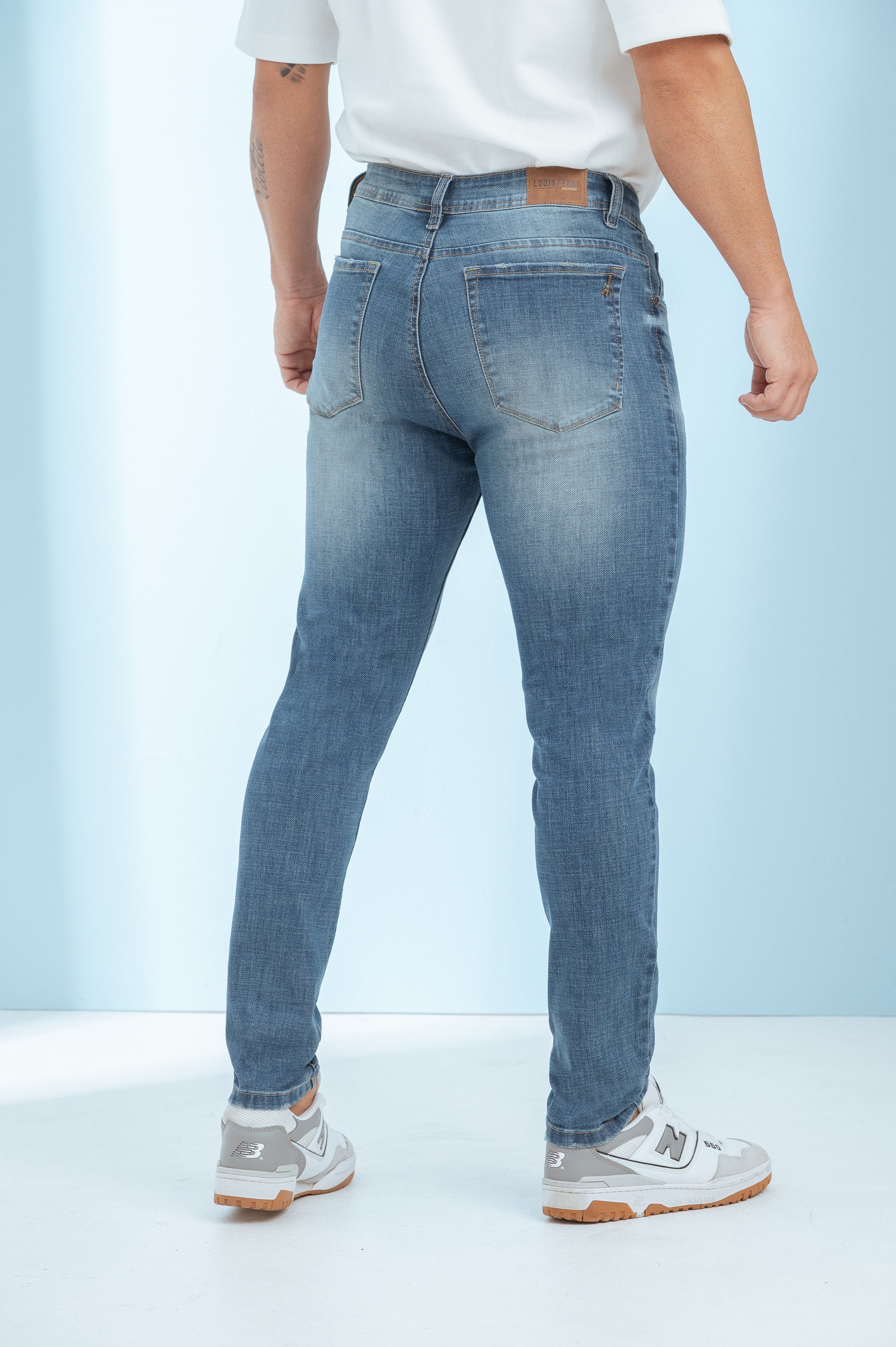 Jeans hombre semi recto ,tono azul medio , con desgaste , strech.