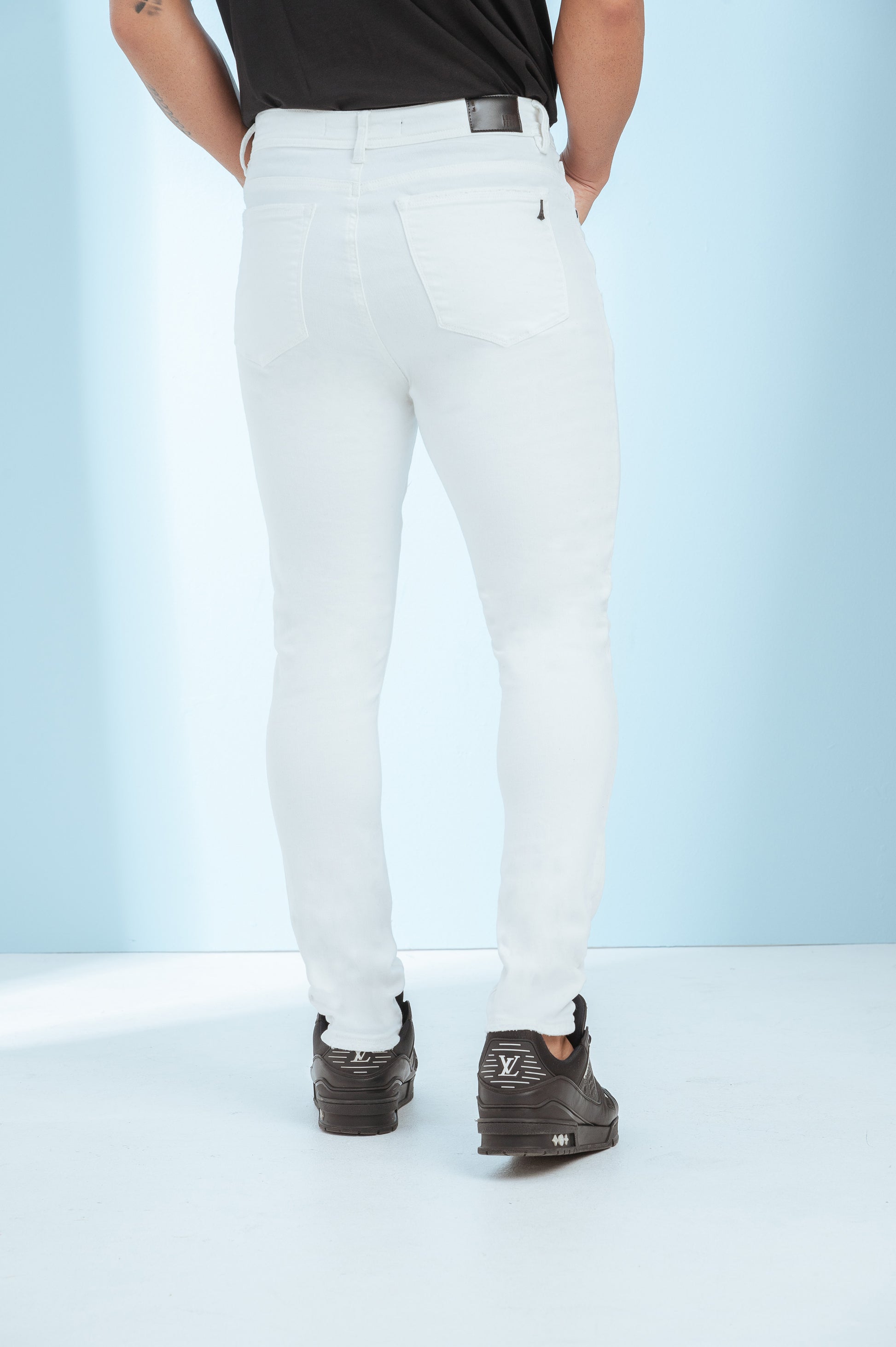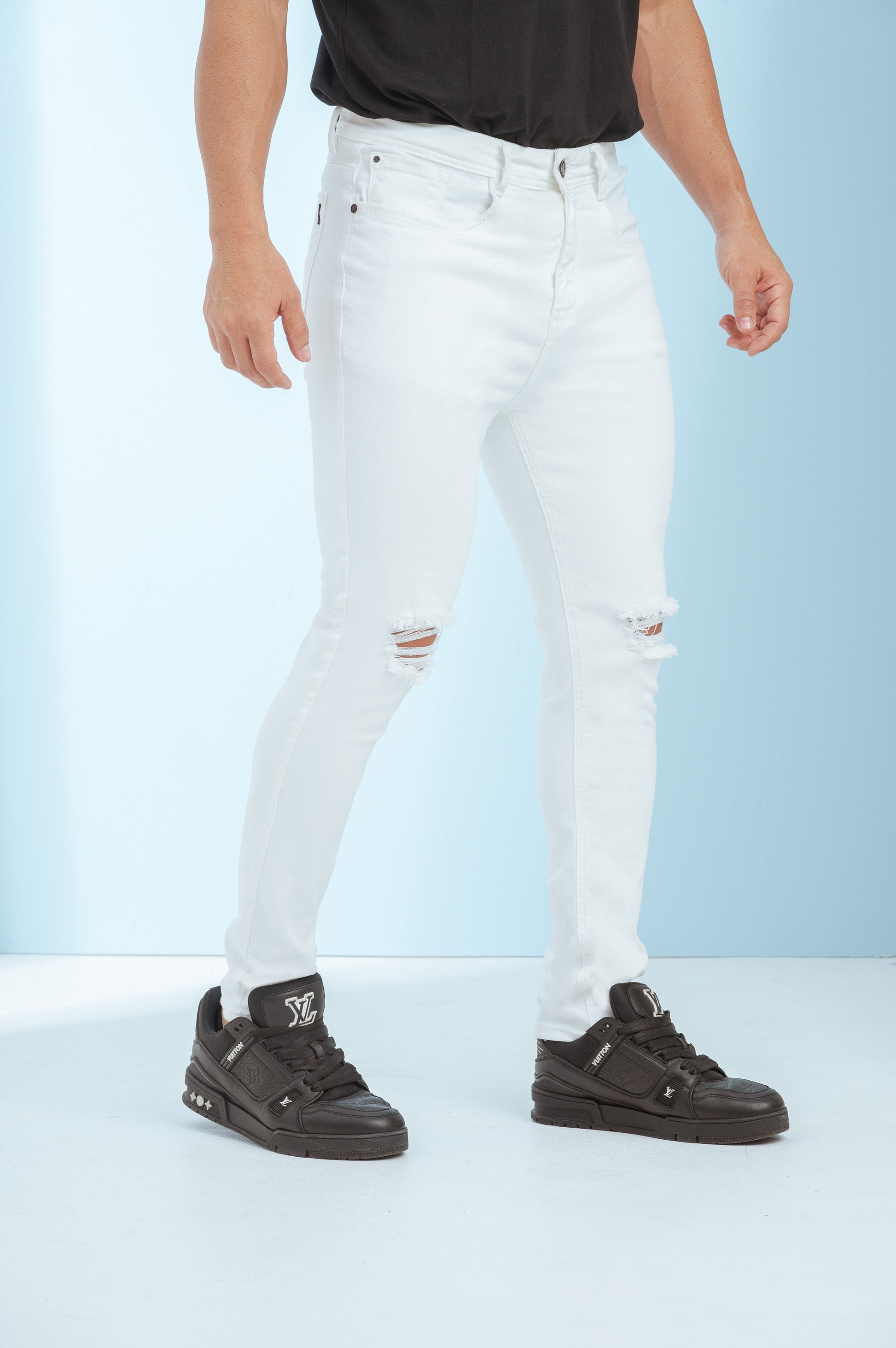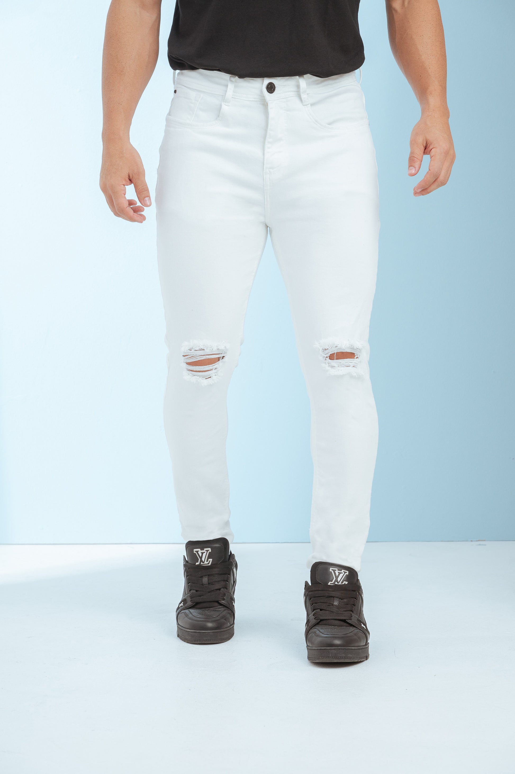 skinny jeans hombre , color blanco ,con rotos en rodilla , strech.