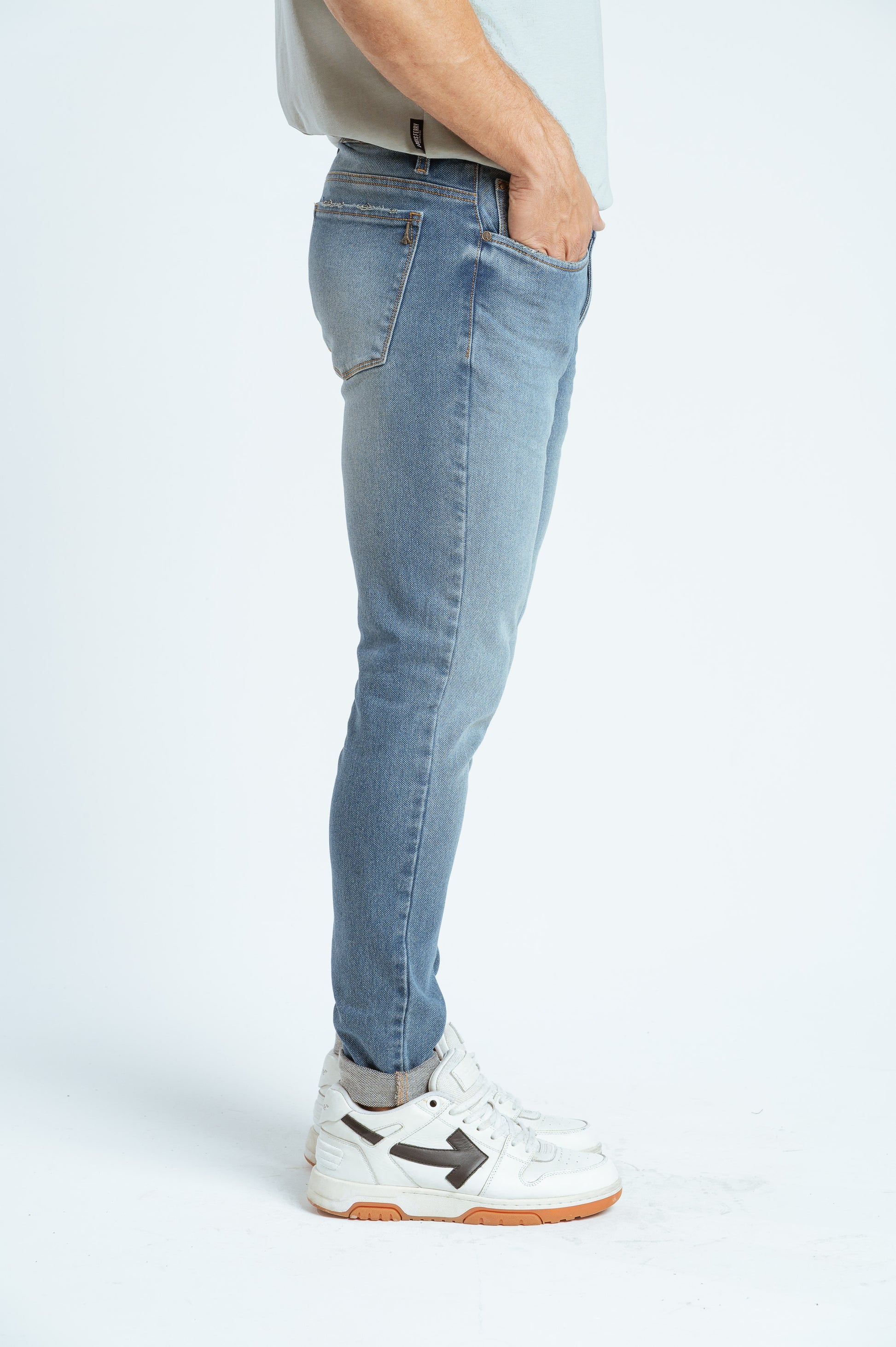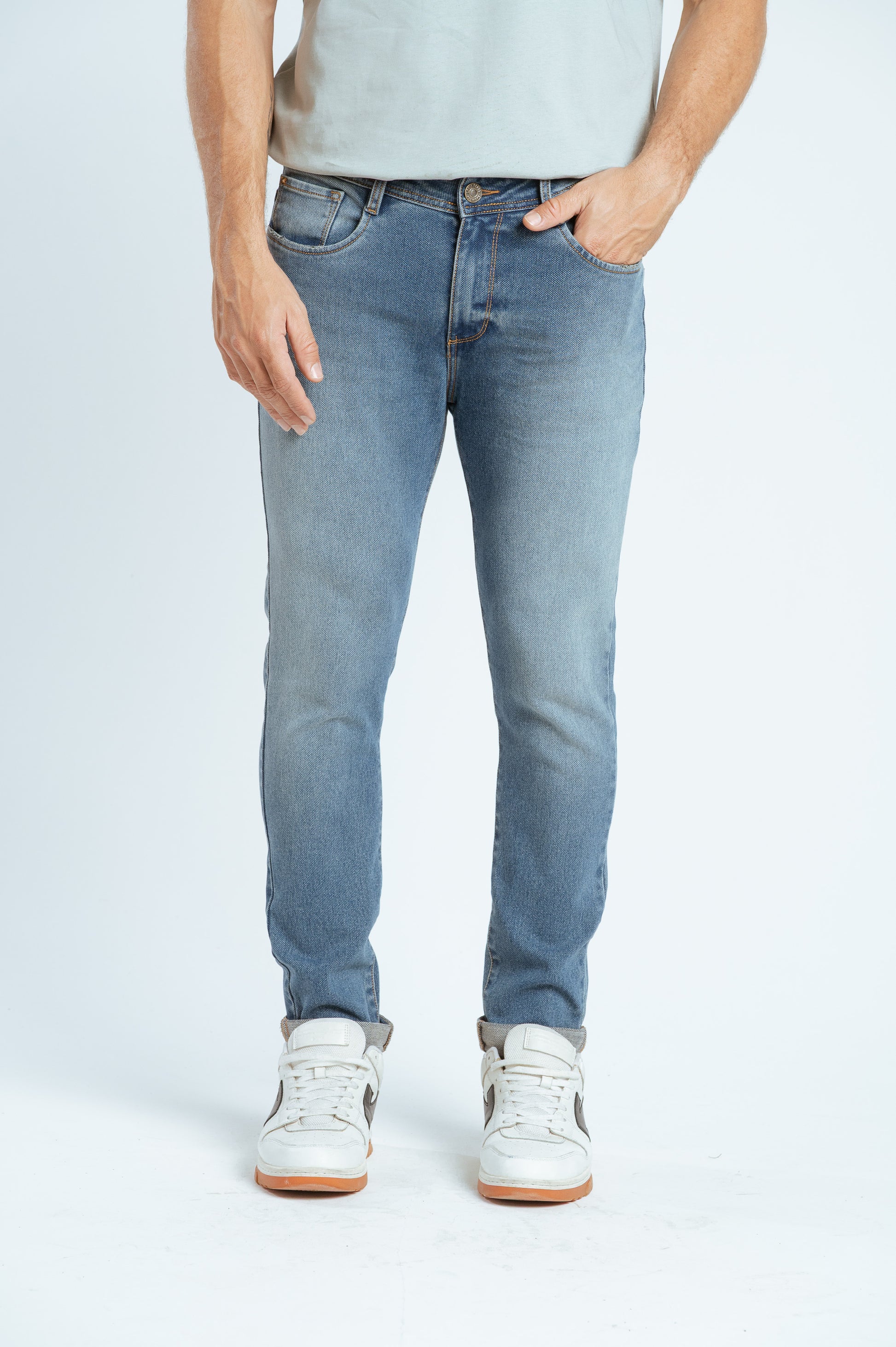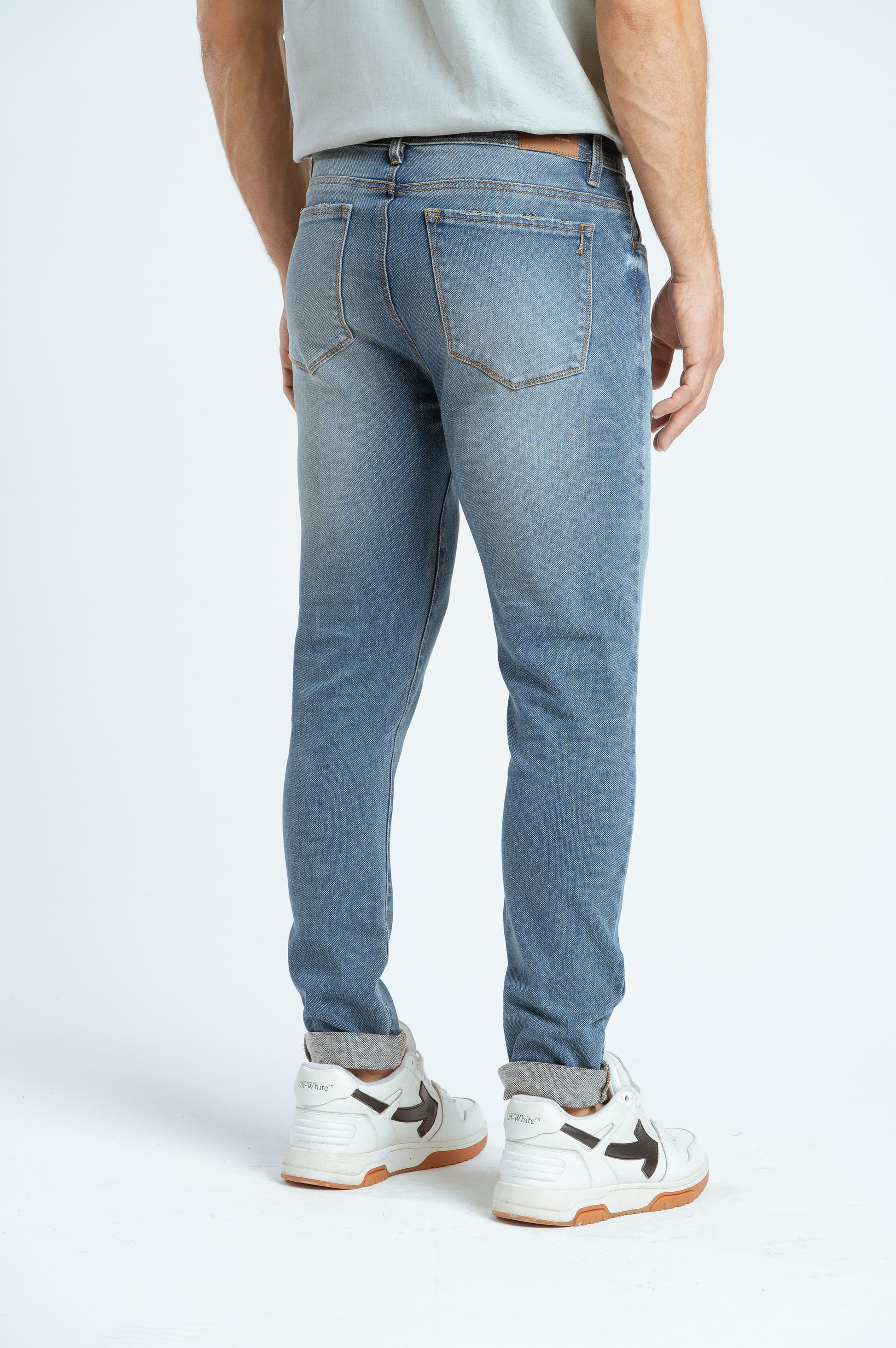 Skinny jeans hombre , bota clasica , tono azul medio , strech.