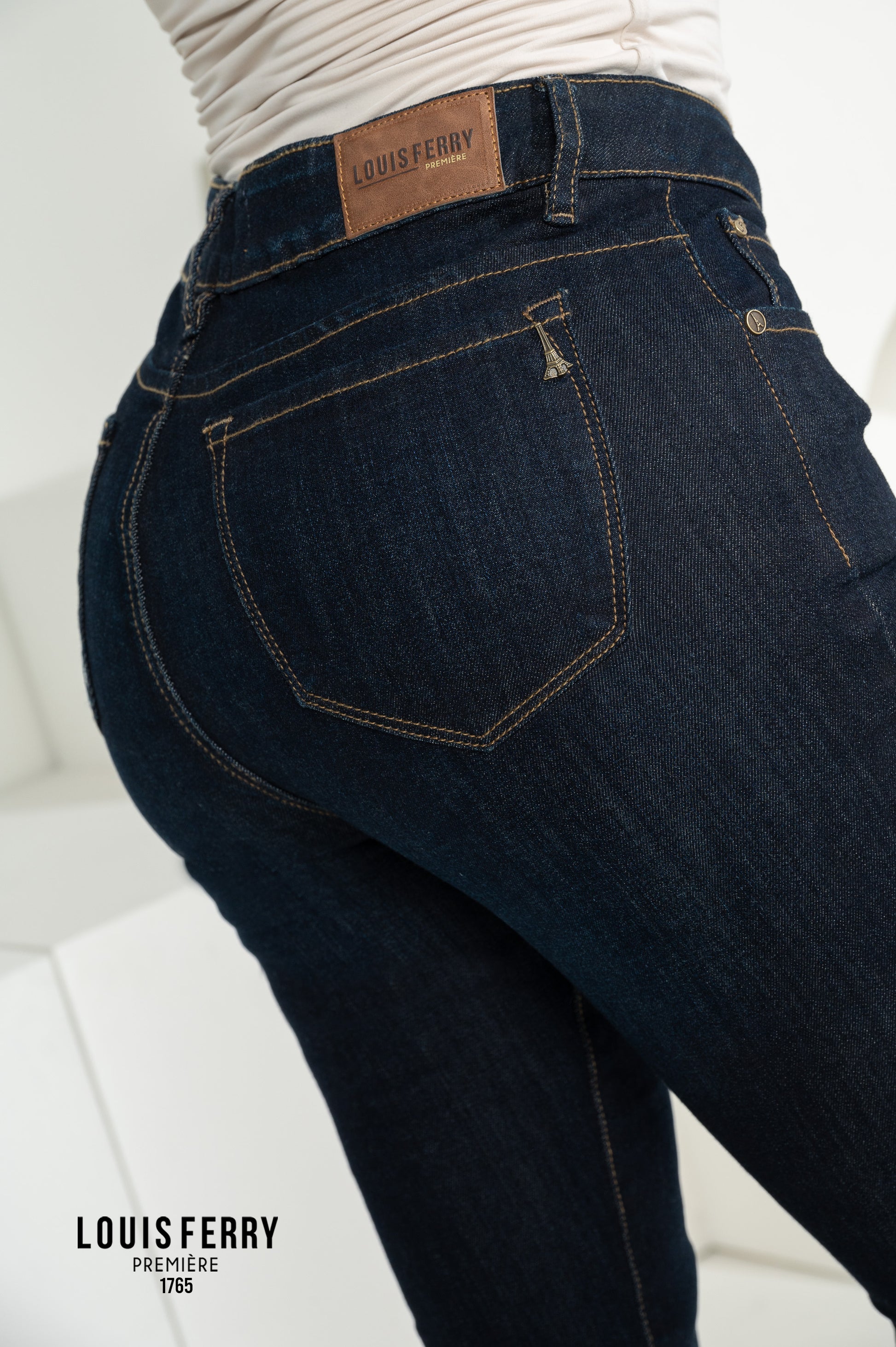 Skinny jean para mujer, color azul oscuro. Materiales: 69% Algodón, 3% Rayón, 25% Poliéster. Tiro alto. Clásico bota tubo.