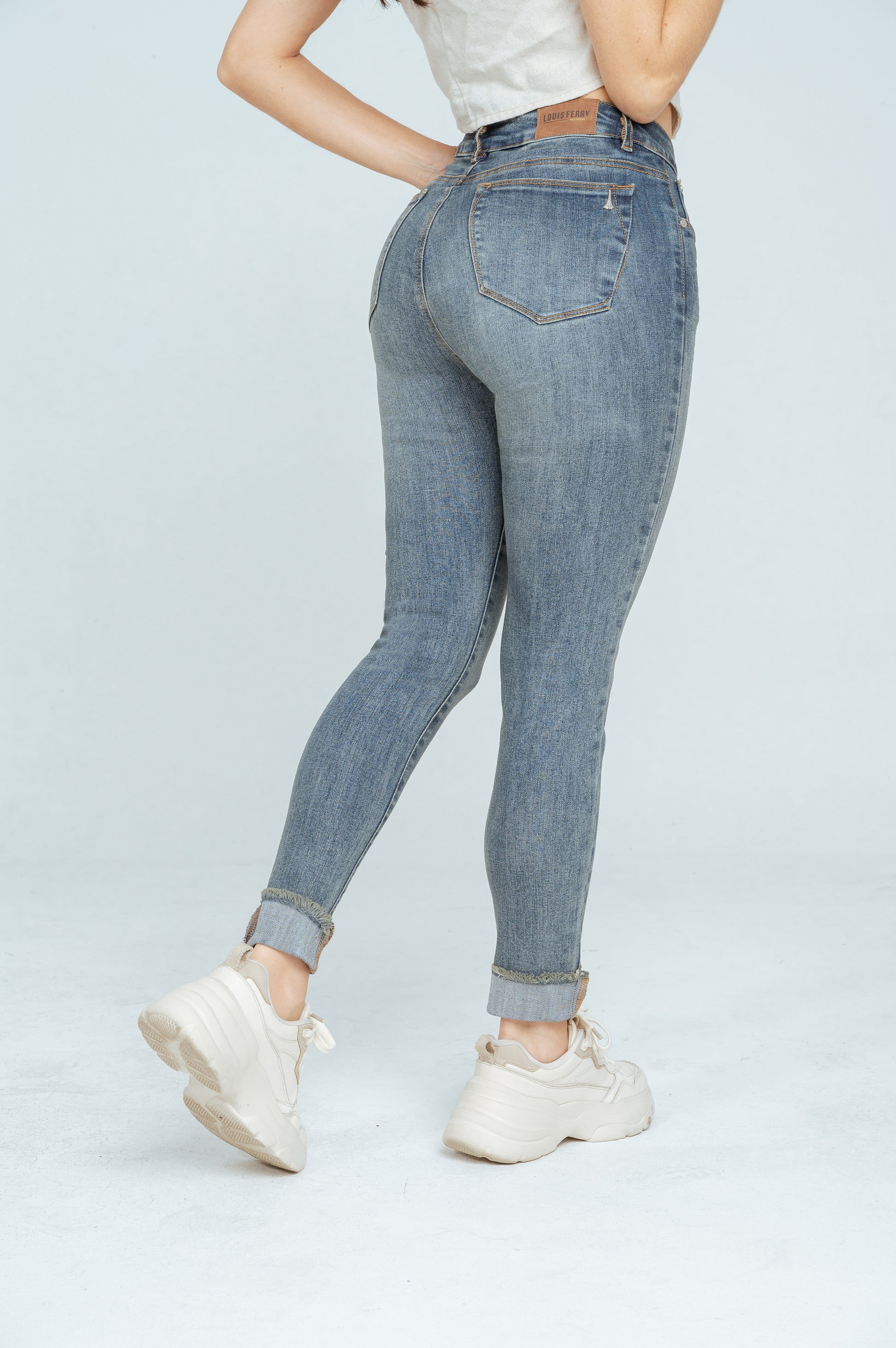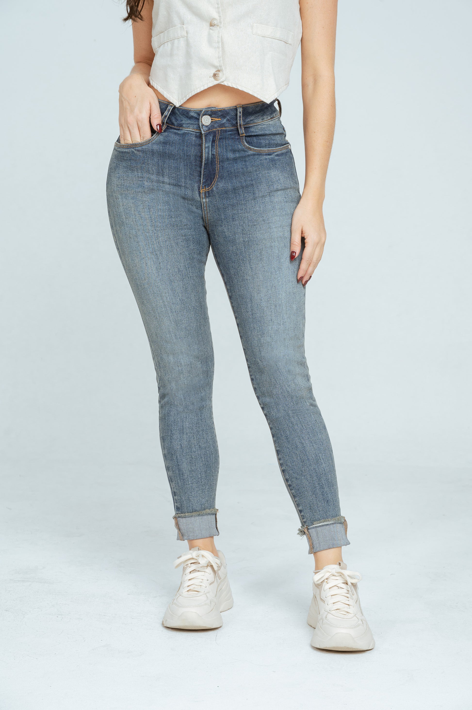 Skinny jeans , tiro medio , bota doblada , tono azul claro , strech.